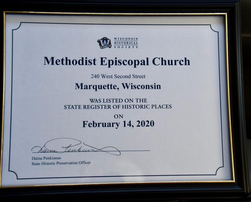 The Marquette Historical Historical Society is proud to announce our Methodist Episcopal Church (Museum) has been listed on the State Register of Historic Places.This came after two years of work by Jean Winther (Secretary of the Marquette Historical Society) and Art Cybul (Village of Marquette President). Jean Winther gave a wonderful presentation to the Architecture board of the Wiscosnin Historical Society, who unanimously voted in favor of the nomination. The next step was to be reviewed by the entire board of the Wisconsin Historical Society and once again, we were unanimously accepted. This is a huge honor for our little, beautiful church. Thank you to representative Joan Ballweg for the letter she sent the board supporting our efforts.(Narrative and photos by: Renee Cybul & Rudy Winther)