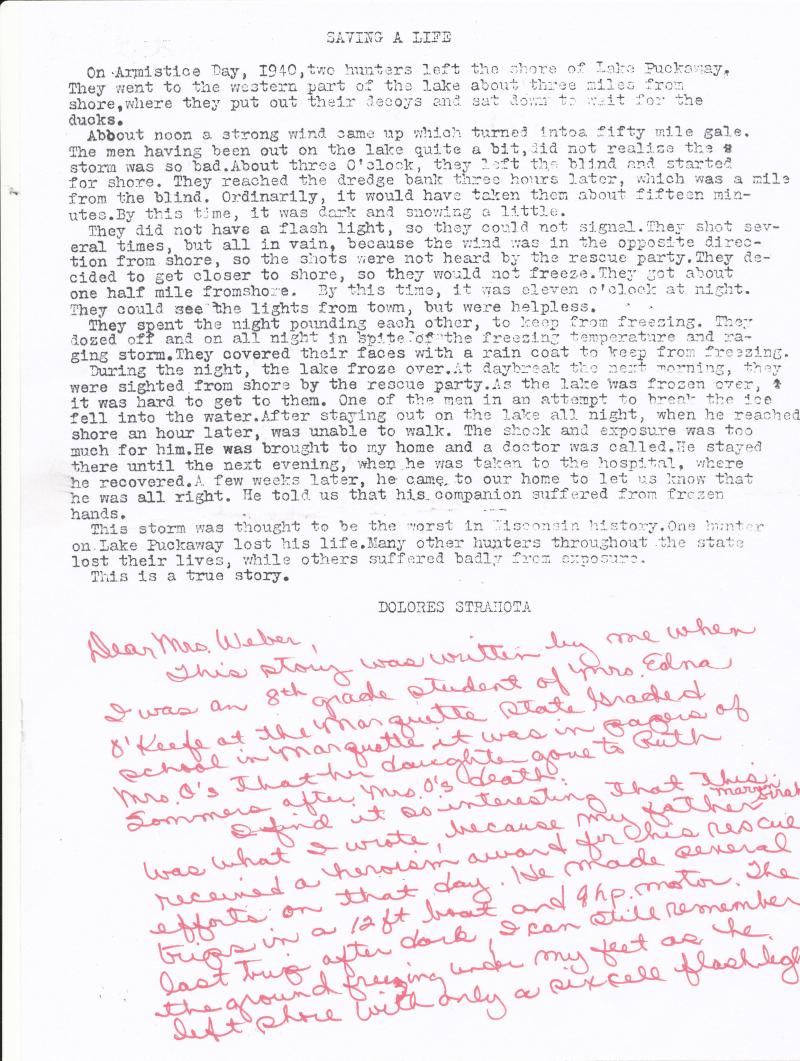 Delores Schweder nee Strahota wrote a most interesting story of The Armistice Day storm in 1940 that roared through Wisconsin causing numerous deaths, especially of duck hunters. Her story is a direct account of the event on Lake Puckaway which included her father, Marvin Strahota, who rescued numerous duck hunters stranded on the lake during that horrific storm. Marvin received a heroism award for his efforts.